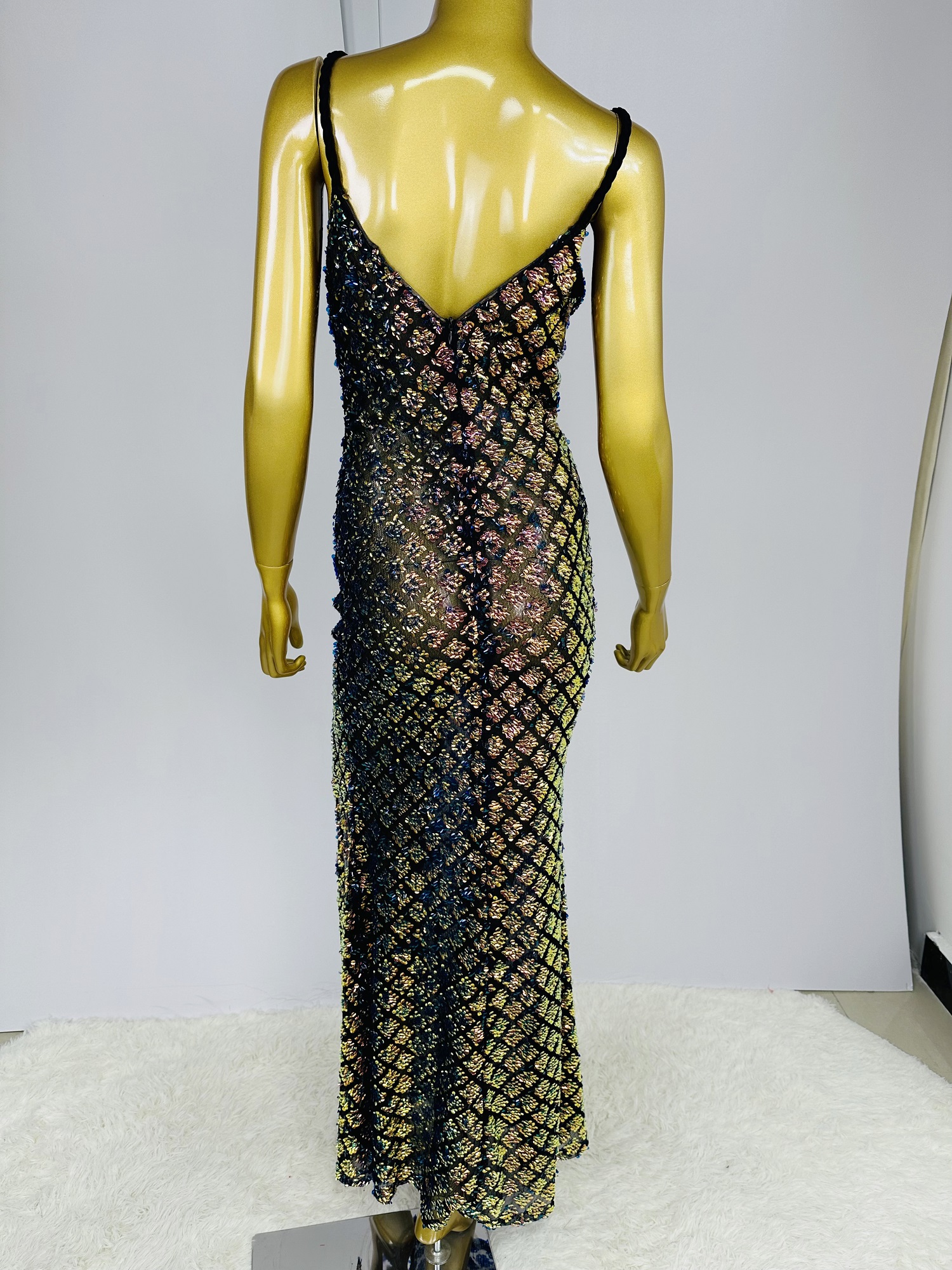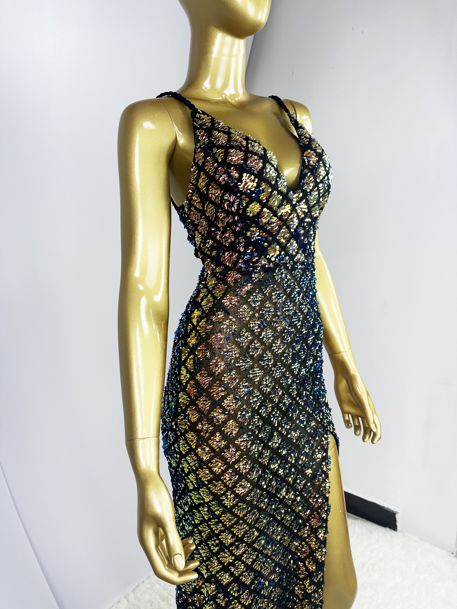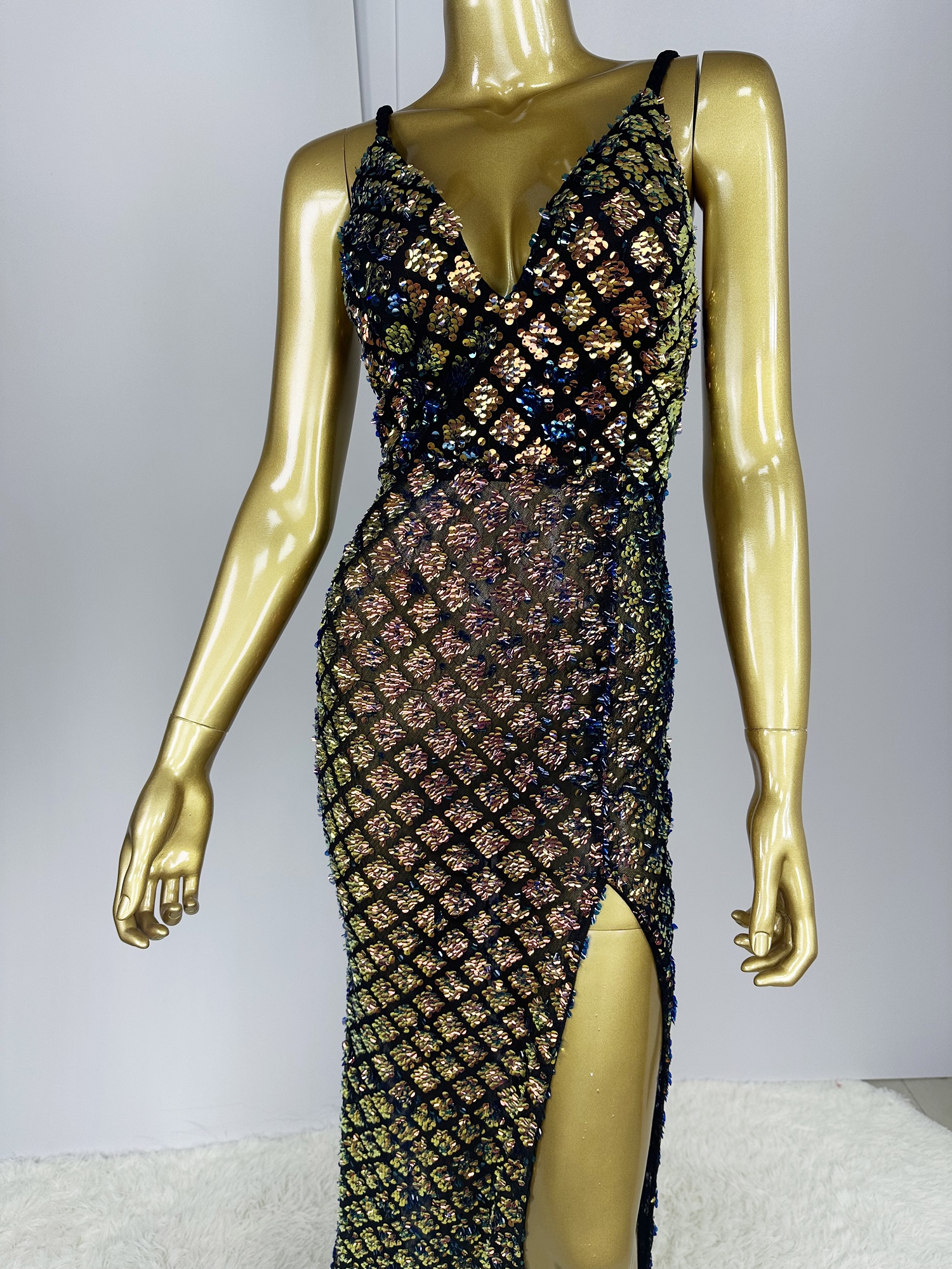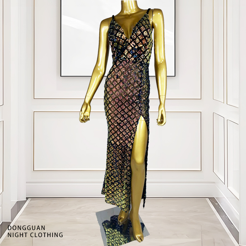 Hot Selling Braided Shoulder Strap V-Neck Semi-Sheer Slim-Fit High-Slit Sequin Evening Gown