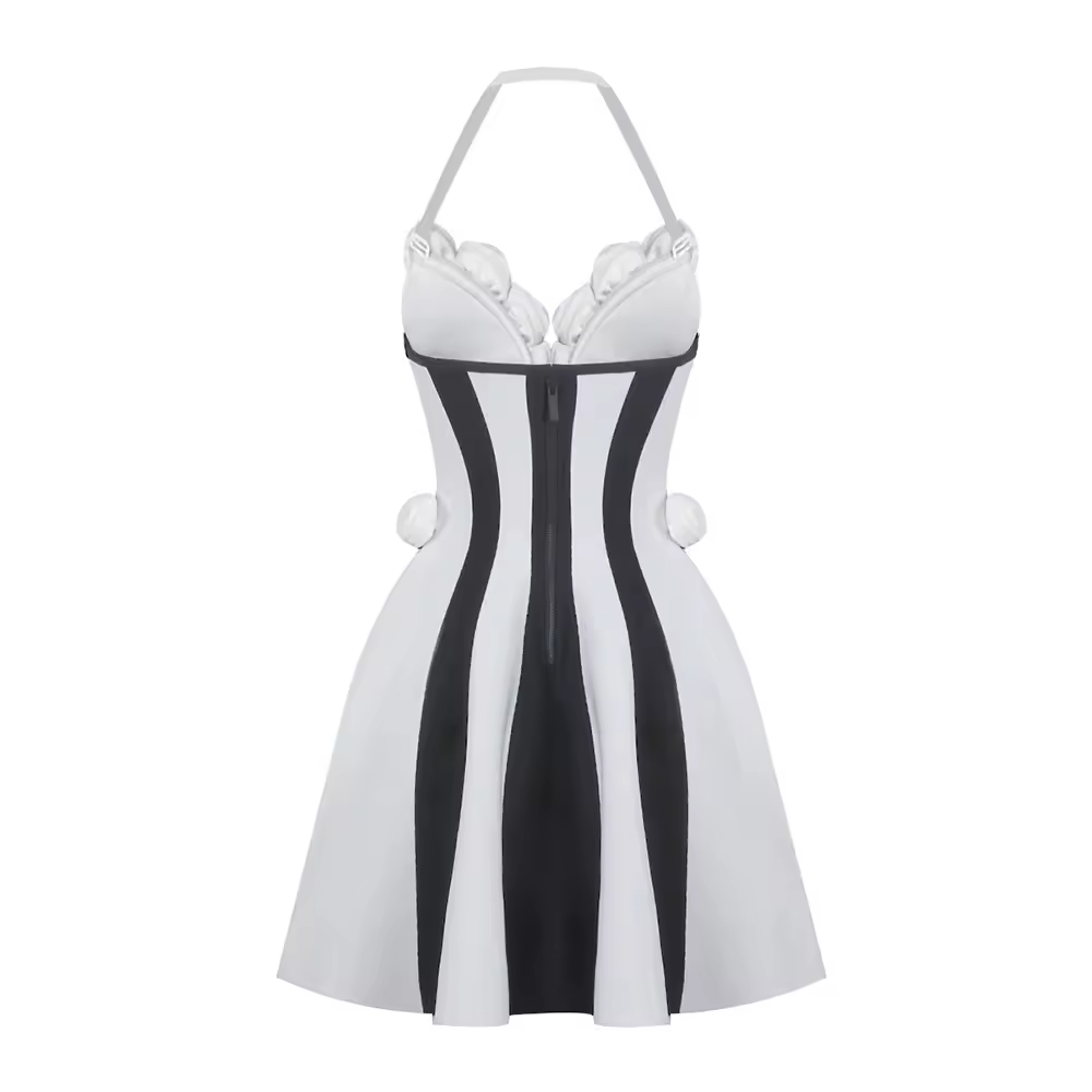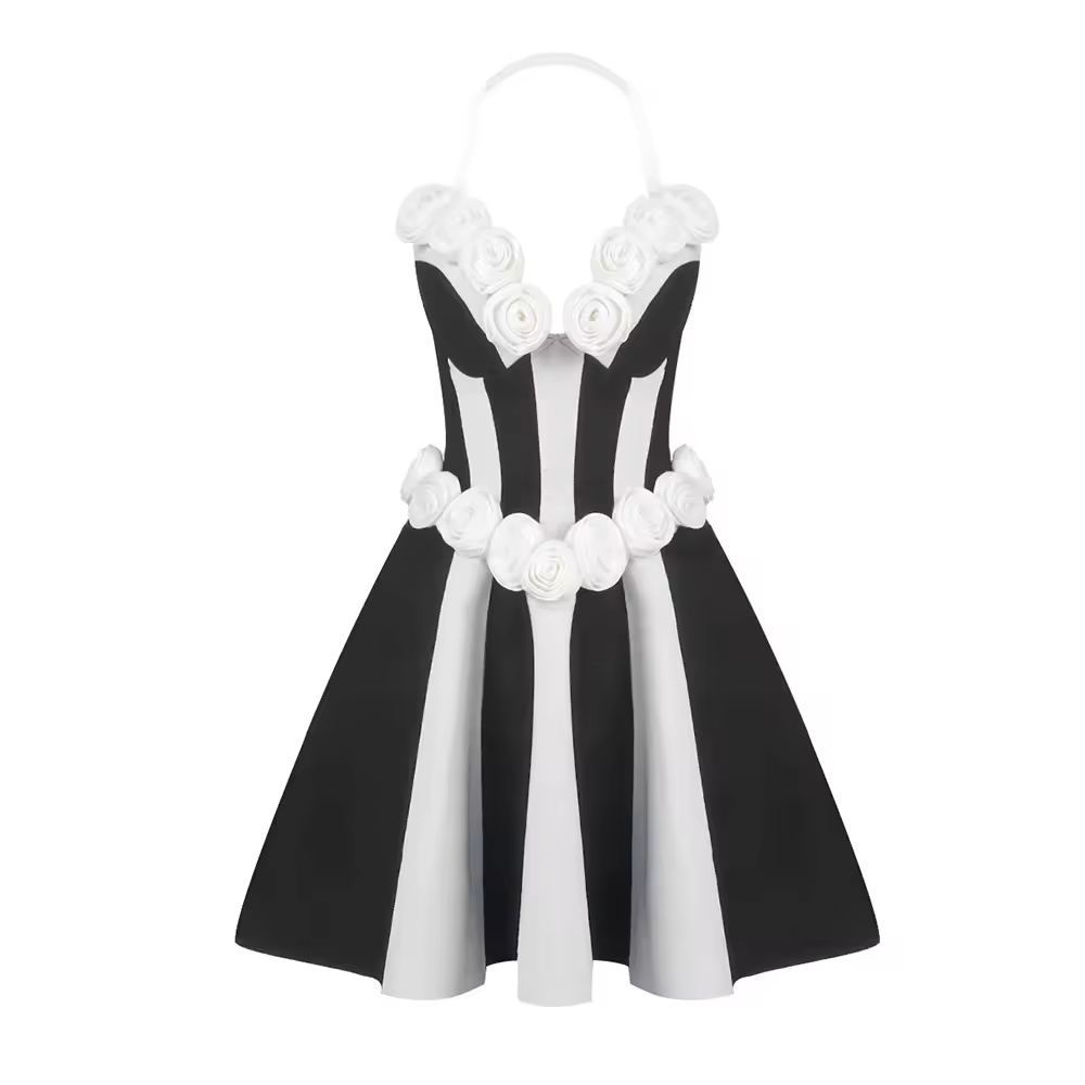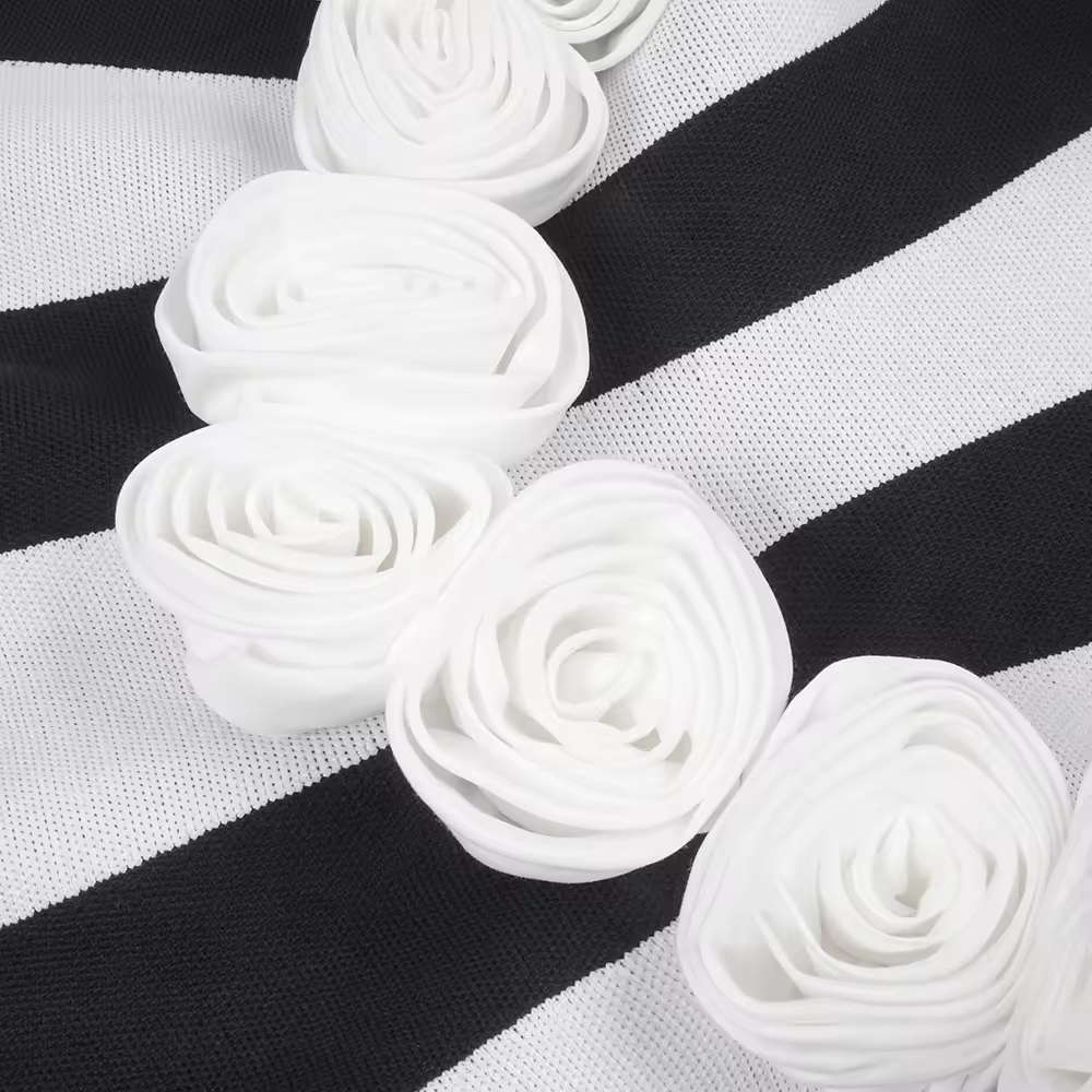 Elegant Floral Jacquard Waist Slimming Dress Black and White Striped Knitted A-Line Design Mini Party Dress for Summer